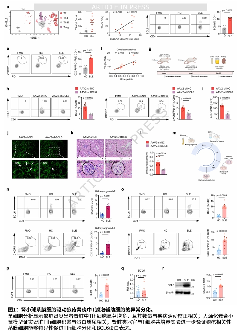 研究团队首先分析了狼疮肾炎患者的单细胞肾脏数据集,发现肾脏中T滤泡辅助细胞显著增多。在此基础上,研究人员利用人源化嵌合小鼠模型证实了肾脏Tfh细胞的积累与疾病严重程度相关。通过肾脏类器官与T细胞共培养系统,研究进一步验证了狼疮肾炎患者血浆能够促进Tfh细胞分化。