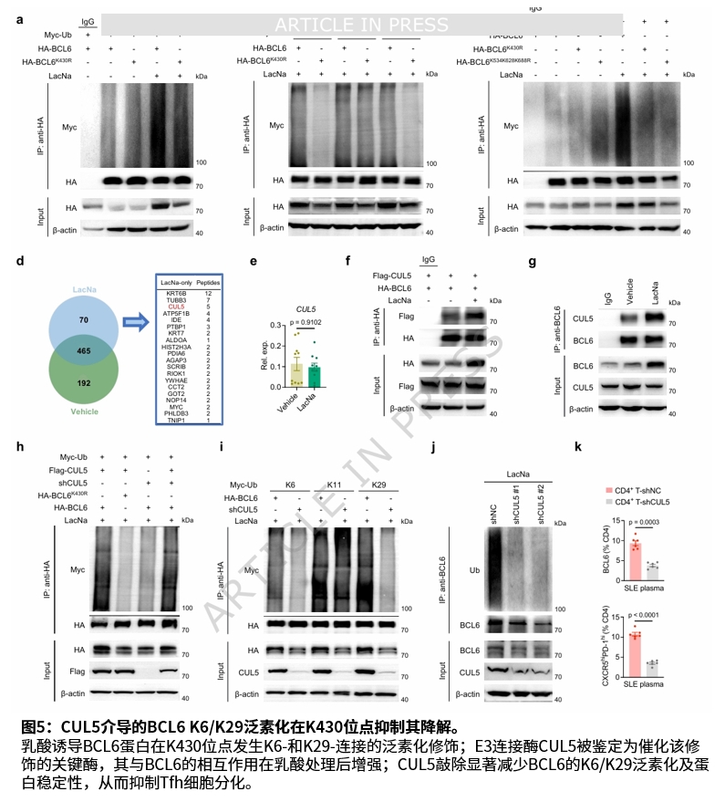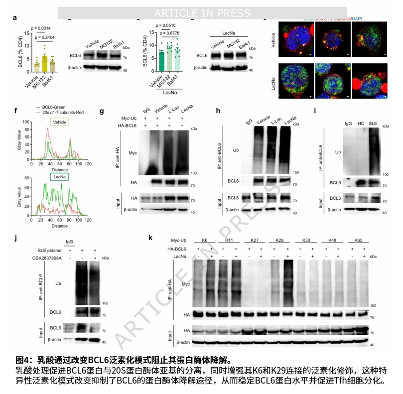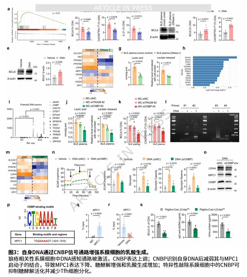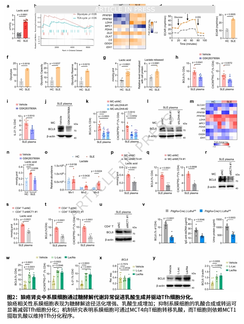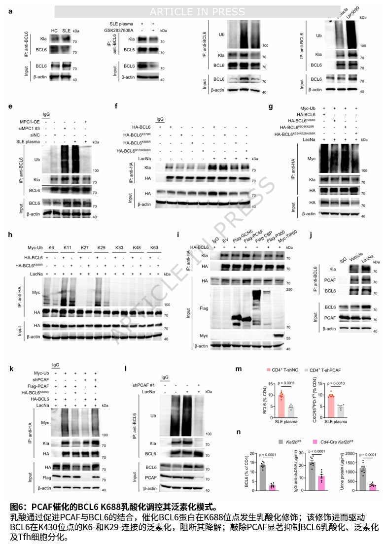 机制研究发现,自身DNA刺激的狼疮相关性系膜细胞通过CNBP介导的MPC1缺陷,导致乳酸生成增加。乳酸进入CD4⁺ T细胞后,通过PCAF催化的BCL6乳酸化及随后的K6-和K29-连接的泛素化,抑制BCL6蛋白酶体降解,从而稳定BCL6蛋白并促进Tfh分化。