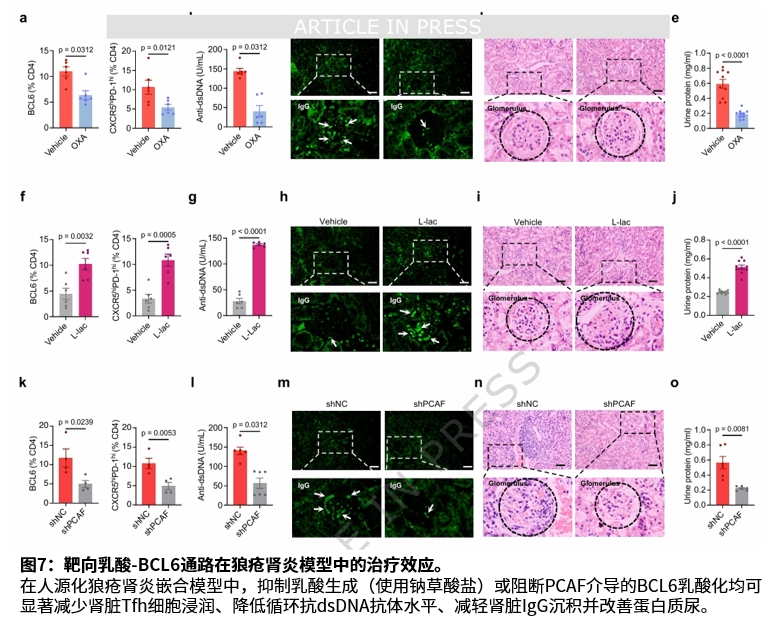 在治疗验证中,靶向抑制乳酸生成或阻断PCAF功能均可减少肾脏Tfh细胞数量并缓解疾病进展。该研究为狼疮肾炎提供了新的治疗靶点。