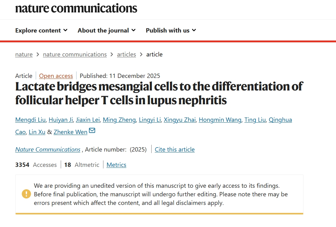 Liu M, Ji H, Lei J, Zheng M, Li L, Zhai X, Wang H, Liu T, Cao Q, Xu L, Wen Z. Lactate bridges mesangial cells to the differentiation of follicular helper T cells in lupus nephritis. Nat Commun. 2025 Dec 11