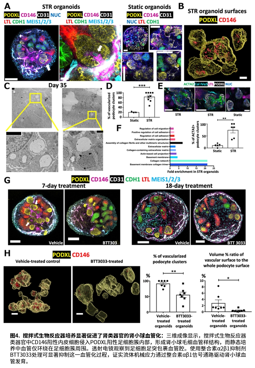 研究发现,流体机械应力通过整合素αβ1信号通路显著促进肾小球血管化。单细胞测序显示,生物反应器培养的类器官中肾小球内皮细胞和足细胞比例明显升高。透射电镜更在类器官肾小球内观察到带足突的足细胞包裹人内皮细胞形成血管腔,这一结构是滤过功能的基础。