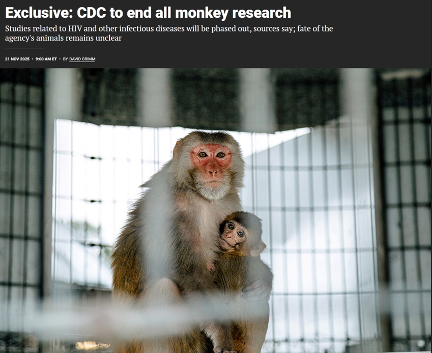 美国疾控中心(CDC)近日决定全面终止所有非人灵长类动物研究,涉及约200只主要用于艾滋病、肝炎等传染病研究的猕猴。这是自十年前美国国立卫生研究院停止黑猩猩研究以来,首个联邦机构完全终止其内部灵长类研究项目。