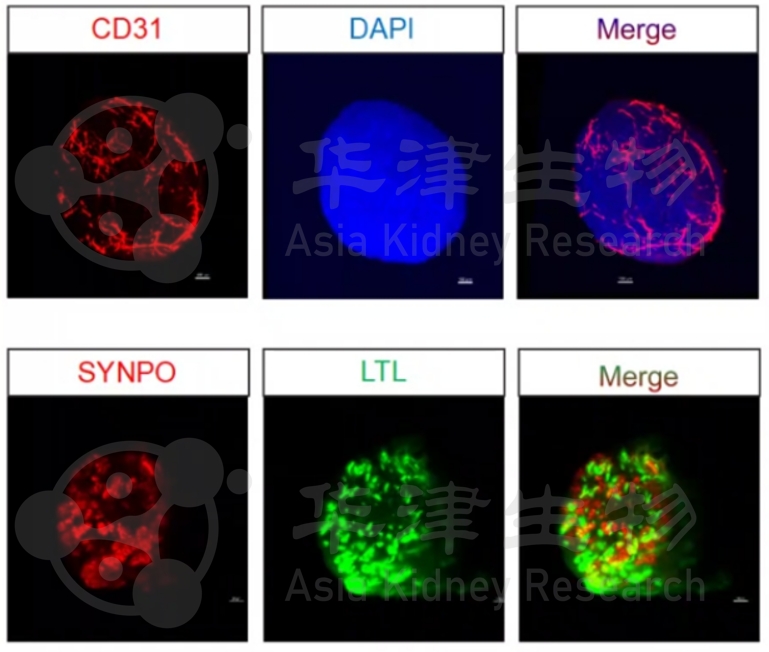 第二组SYNPO/LTL图像显示,肾脏特异性细胞类型已成功分化并形成有序空间分布。SYNPO阳性的足细胞与LTL阳性的近端小管显示出肾单位关键组分的特征性结构。